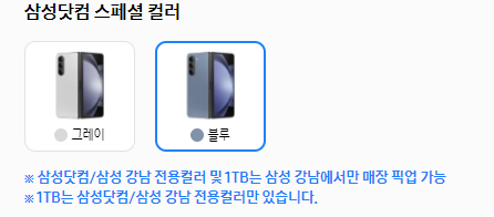갤럭시z 폴드5는 그레이, 블루 2가지 색상이 전용으로 출시됩니다.