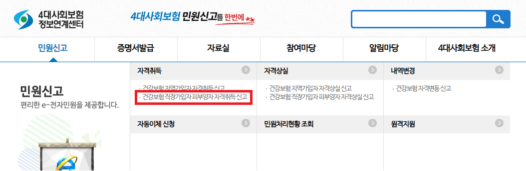 ▷ ' 민원신고 ' → ' 건강보험 직장가입자 피부양자 자격취득 신고 ' 를 선택합니다.