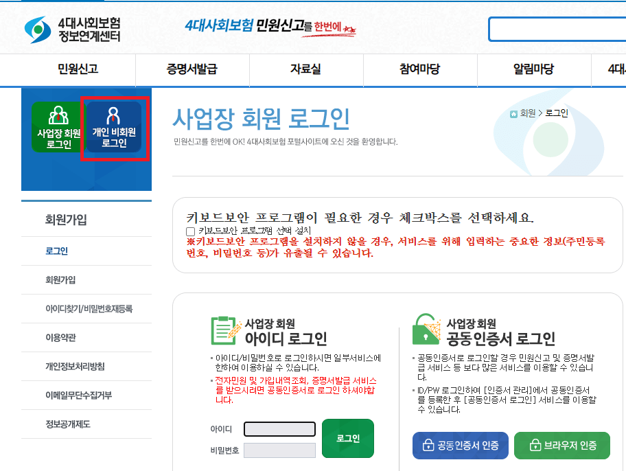 ▷ 개인 비회원 로그인을 시행한다 - 공동인증서, 브라우저 인증서를 통해서 로그인을 해야 합니다.