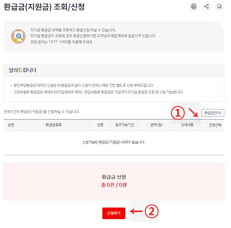 저의 경우에는 환급금 조회이 없다고 나타나는데요, 금액이 나타난 경우에는 1번 부분을 체크한 후에 2번을 눌러서
