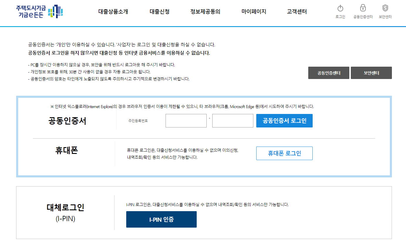 ▷ 대출 상품을 선택하면 로그인을 해줍니다. 공동인증서 또는 휴대폰으로 로그인을 해줍니다.