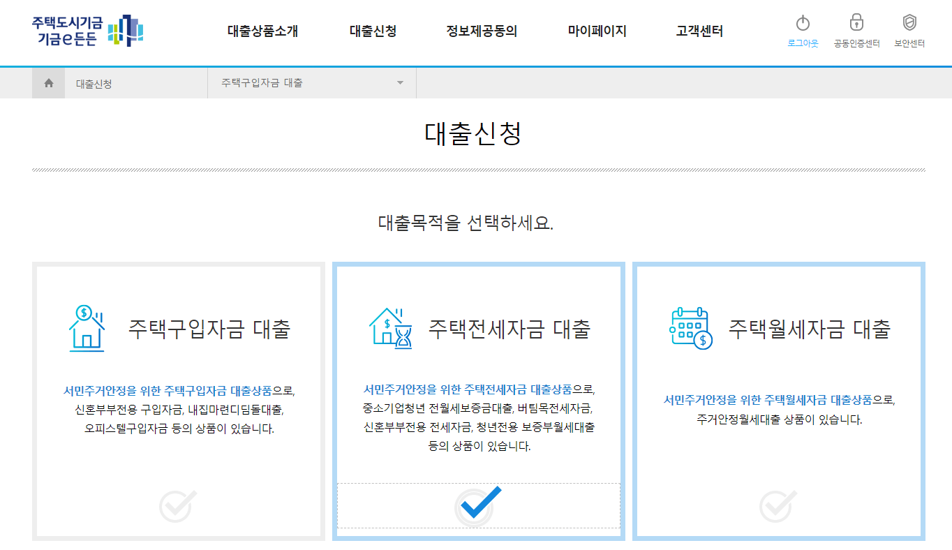 ▷ 이후에는 대출 상품을 선택해 주면 됩니다. (전세대출 예시)