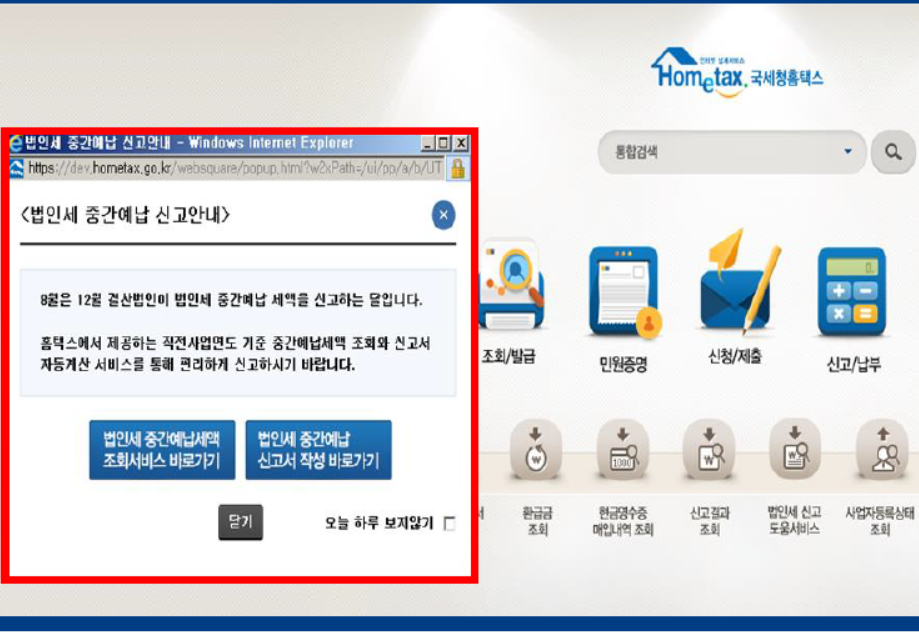 ▷ ① 원스톱 전급 서비스 : 팝업 팡을 통해 손쉽게 신고화면 접속(법인 로그인)