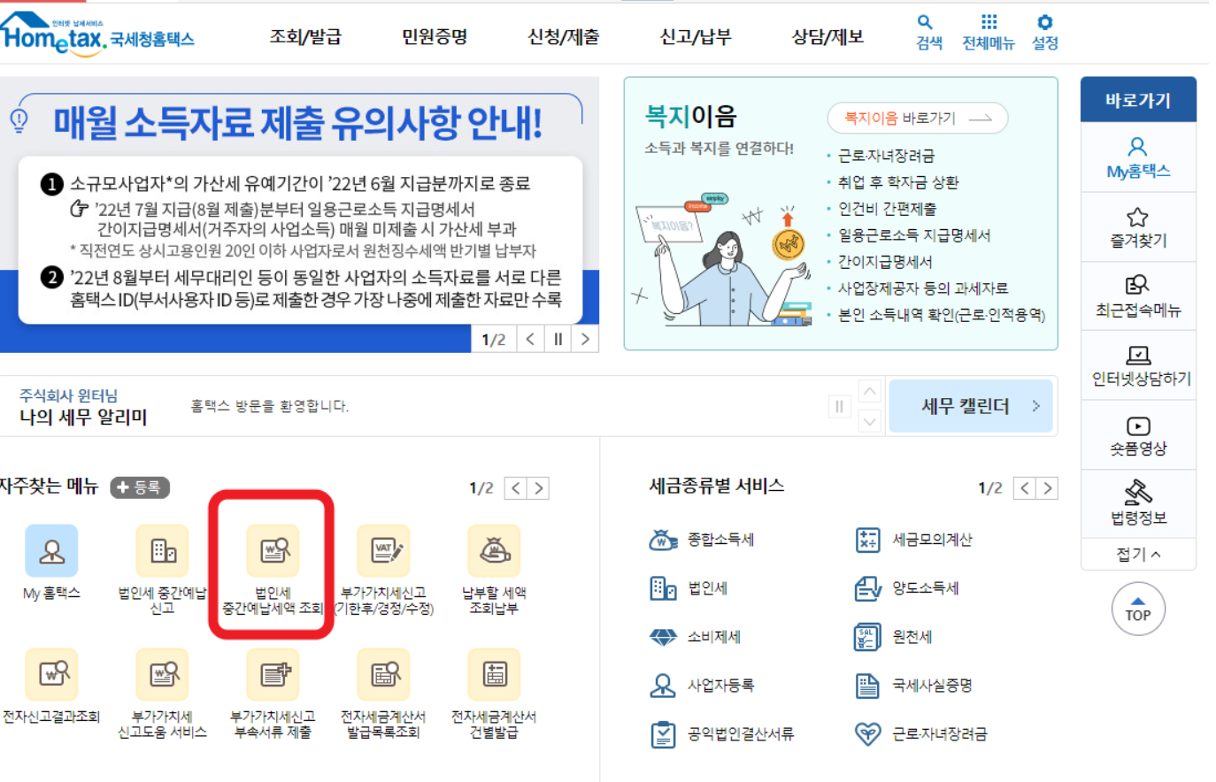 ▷ 온라인 홈택스에 법인으로 로그인 후 [법인세 중간예납세액 조회] 클릭