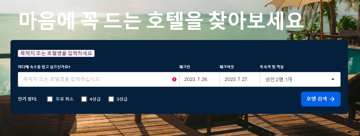 ▷ 호텔 카테고리에 들어오면 여행하고자 하는 도시를 입력하고, 숙소에 머무는 체크인 , 체크아웃 날짜를 정하고 투숙하는 인원을 적어줍니다. 저는 방콕에 여행예정이니 방콕으로 입력해 보겠습니다.