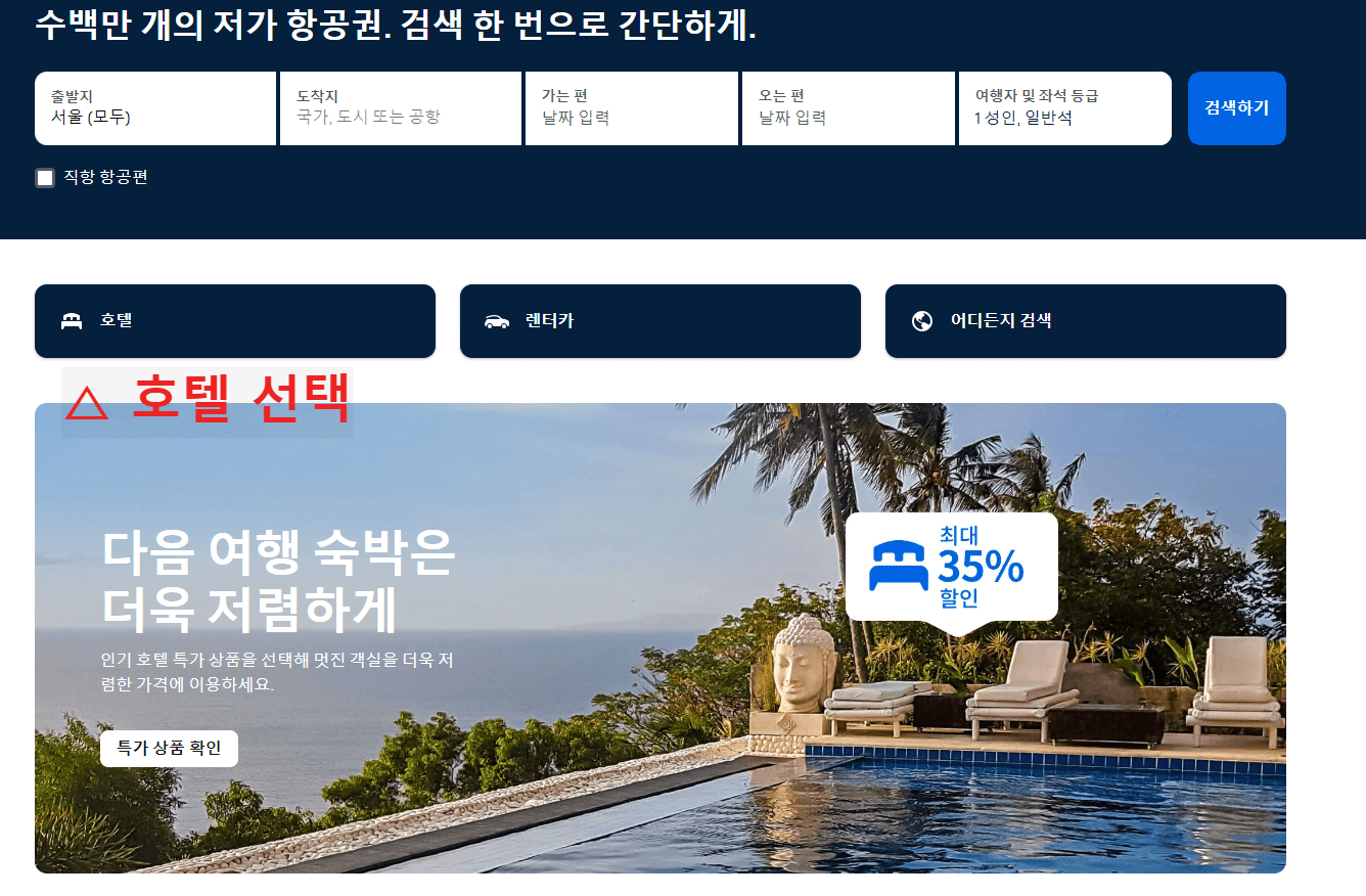 ▷ 사이트에 들어가면 항공권은 예약을 마쳤으니 아래 그림과 깉이 호텔을 선택합니다.