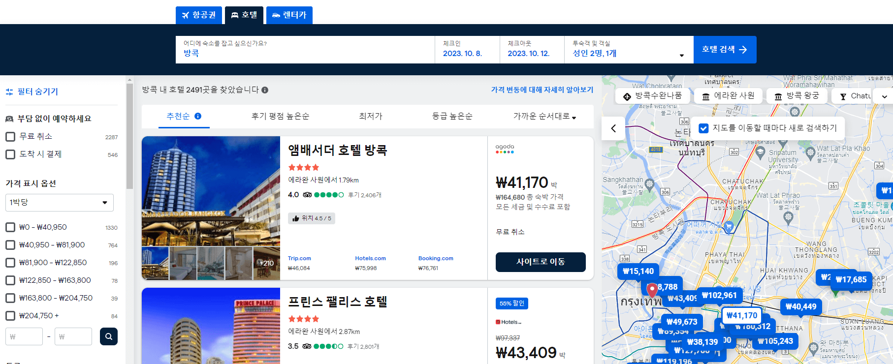 ▷ 입력을 마치면 왼쪽에는 숙소에 사용할 수 있는 예산을 선택할 수 있고, 가운데에는 추천순서대로 해외 숙소가 나타납니다. 오른편에는 숙소들의 위치를 한눈에 볼 수 있습니다.