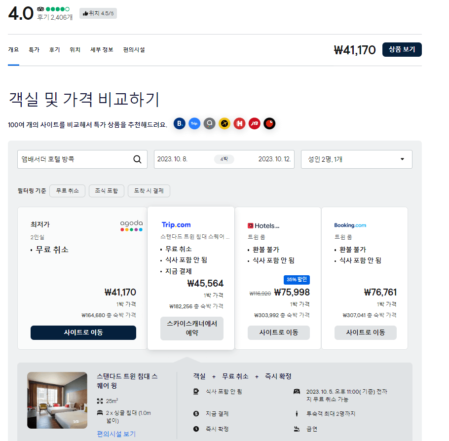 ▷ 중요한 체크인 체크아웃 시간을 확인하고, 조식이 가능한지와 금액등 편의시설을 확인하고, 숙소를 마지막으로