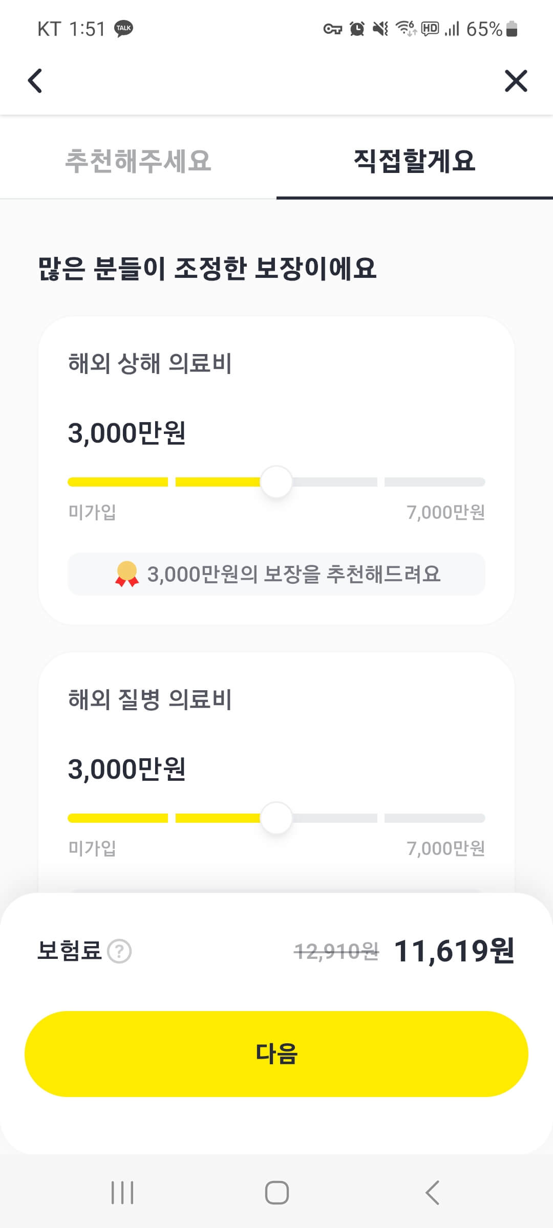 ▷자동적으로 선택해 주는 것이 아닌 직접 보장금액으로 선택할 수 있습니다. 실시간으로 보험금이 산정되니까 본인이 생각한 금액에 맞춰서 보험료를 산정하는 것도 좋은 방법입니다.