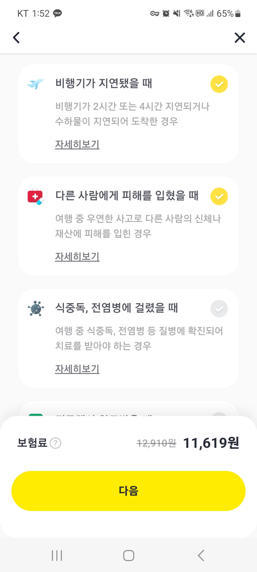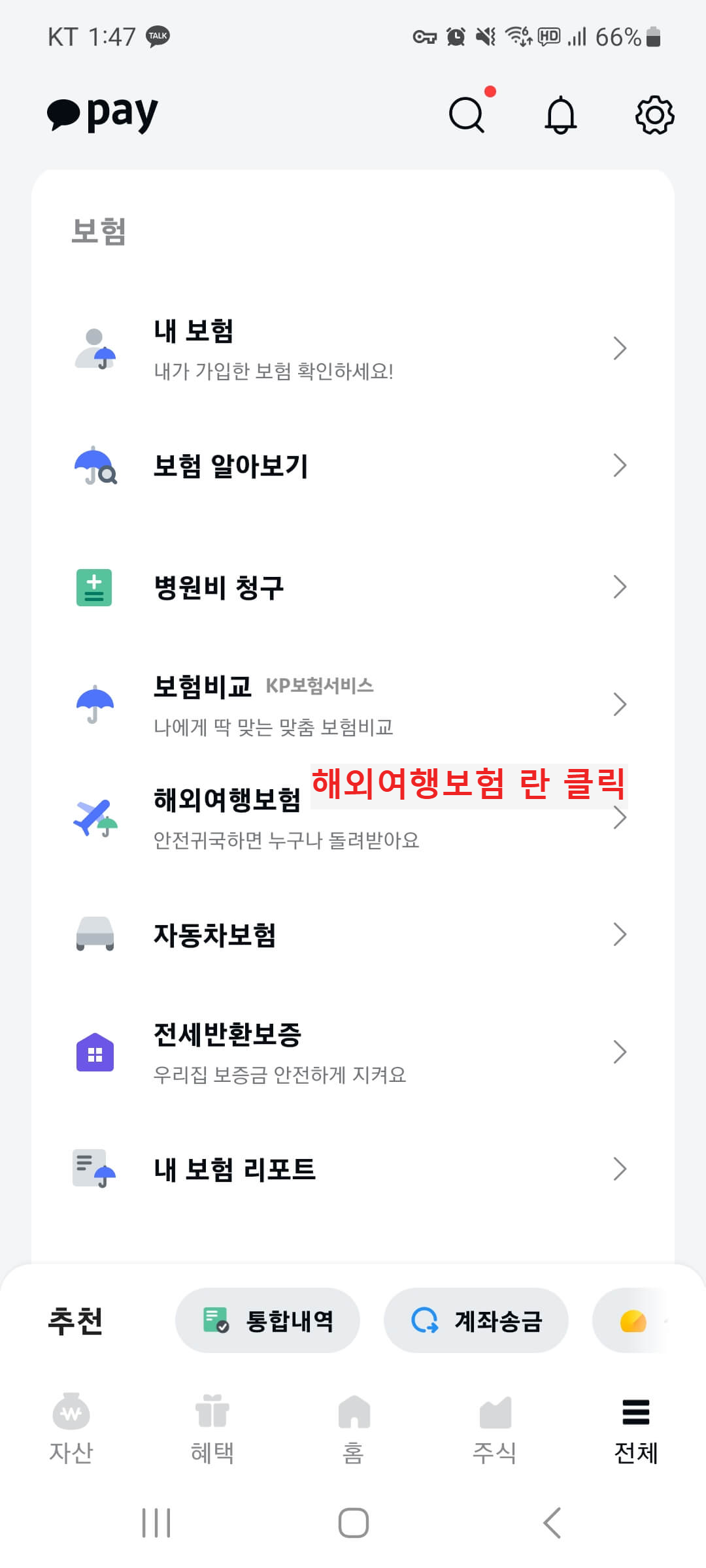 - 스크롤을 아래로 내려서 보험 란에서 ' 해외여행보험 ' 란을 눌러주세요.