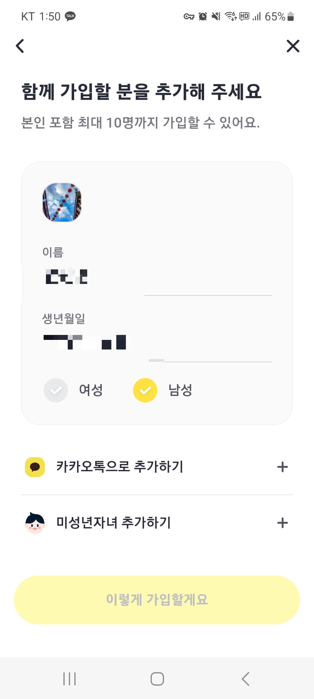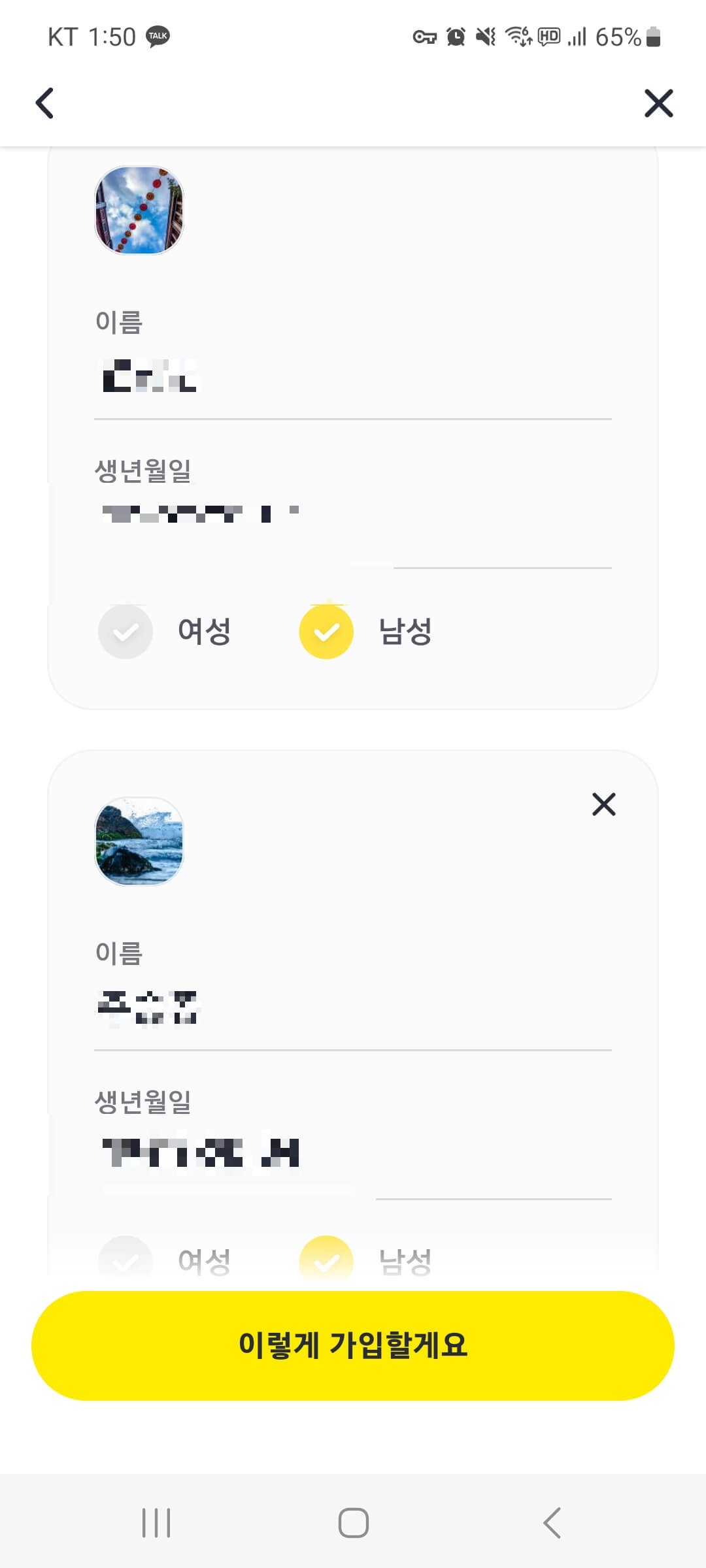 적어줍니다. * 카카오톡에 없는 미성년자의 경우에는 추가하기로 인적사항을 적으면 됩니다.