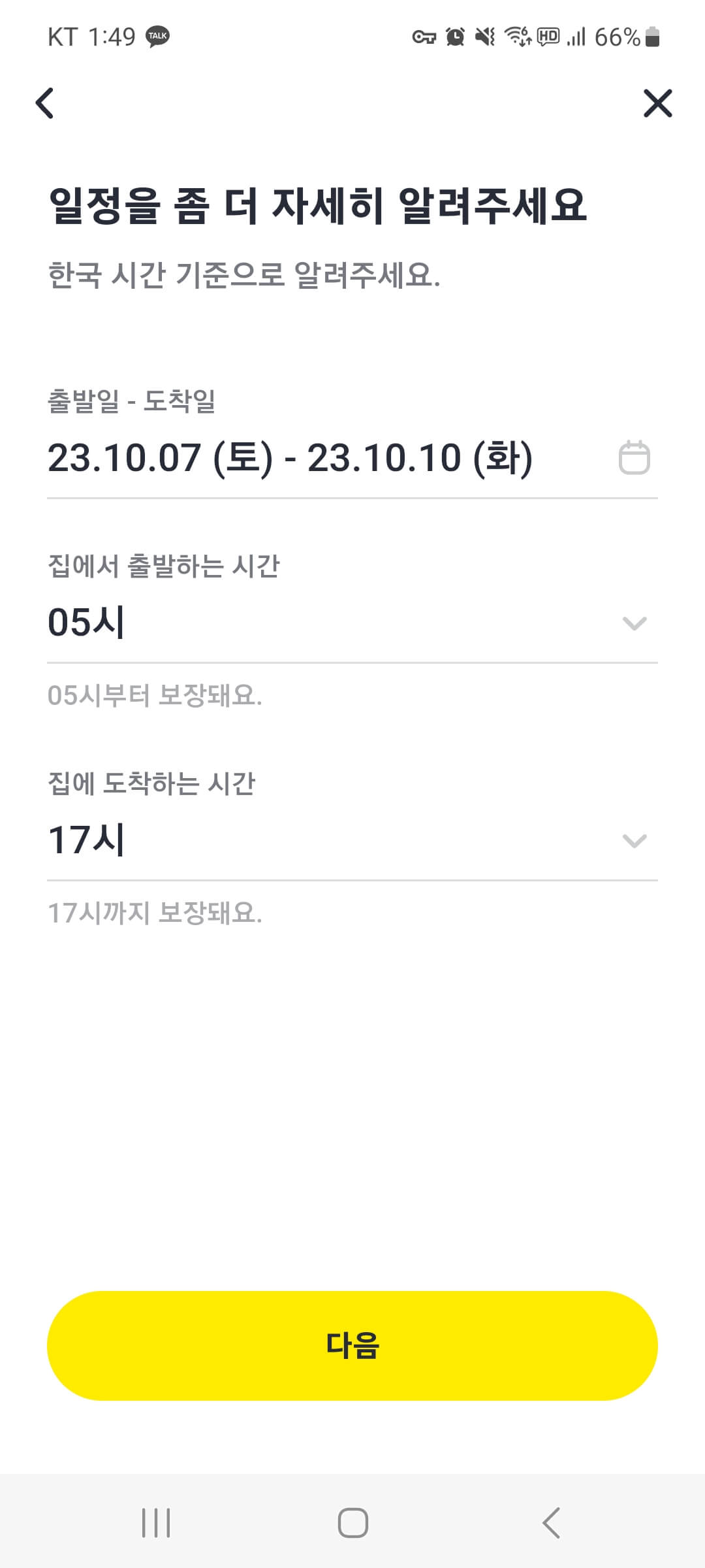 - 이후에 일정으로 집에서 출발하는 시간에서- 집에 도착하는 시간을 적어줍니다. 이 시간대까지가 보험이 적용되는 시간입니다.