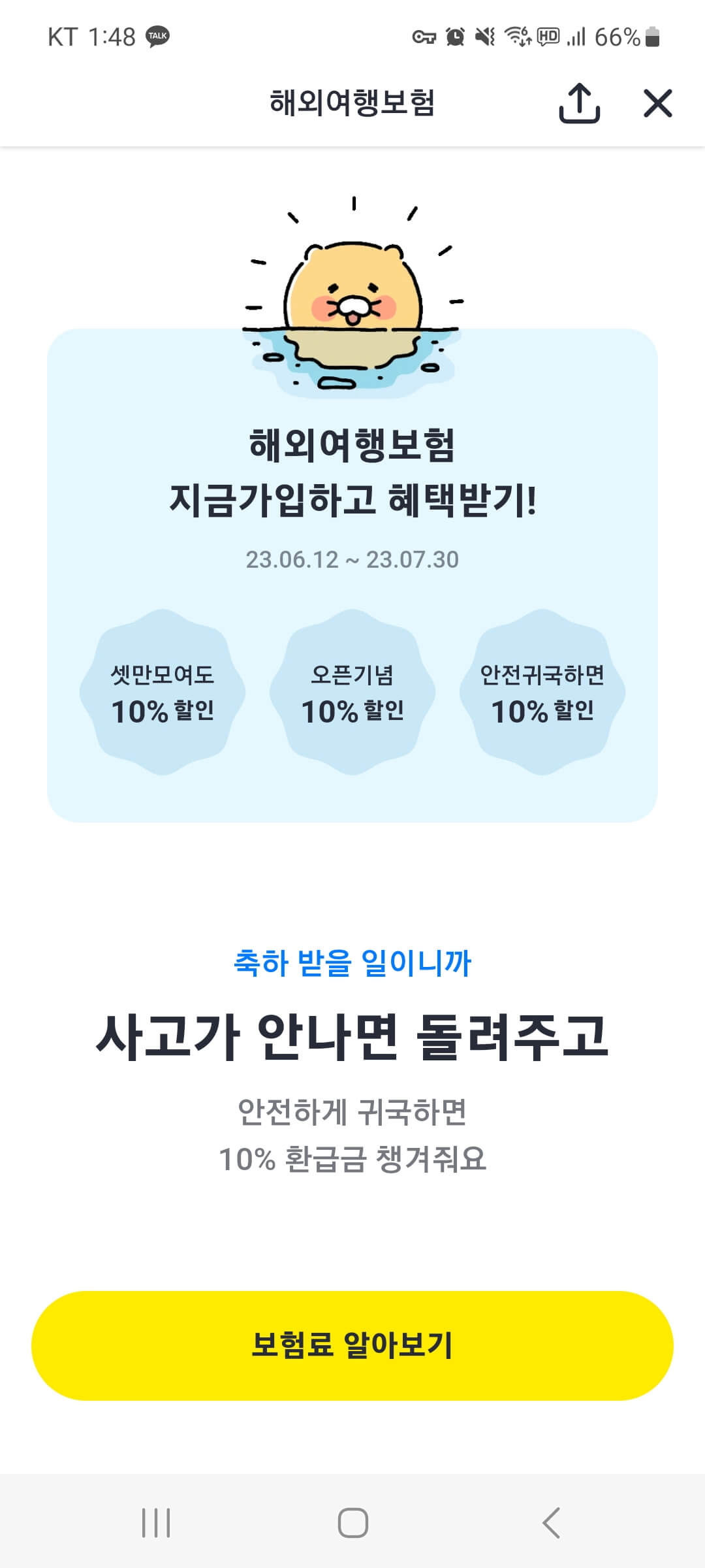 ' 안전귀국 할인 환급금 ' 10%를 돌려받을 수 있으니 이번 여름휴가 해외여행 시 카카오 페이 보험으로 안전하게 다녀오세요.