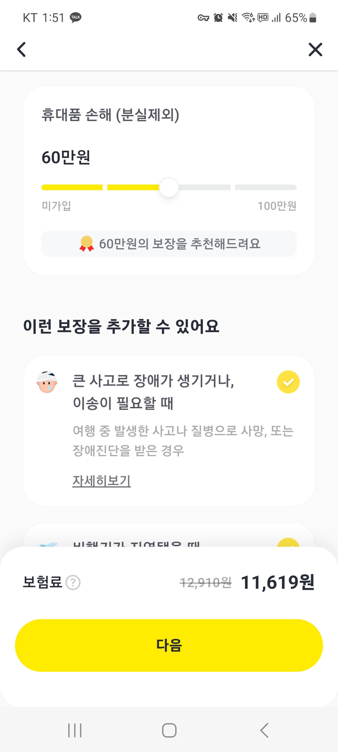 - 일정을 모두 적고 ' 다 음 '을 눌러주면 기본 보험료가 산정되어 나타납니다.