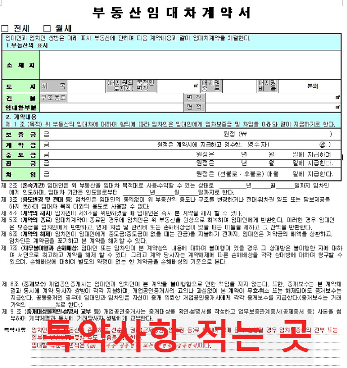 ▷부동산 임대차계약서를 보면 아래의 사진과 같이 특약을 적는 곳이 있습니다. 이곳에 특약 사항에