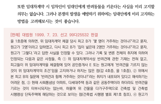 ▷ 그리고 집주인이 미리 반려동물에 관하여 물어보거나, 특약사항을 넣지 않는다면, 임차인에게 미리 말을 할 의무는 없다고 말하고 있습니다.