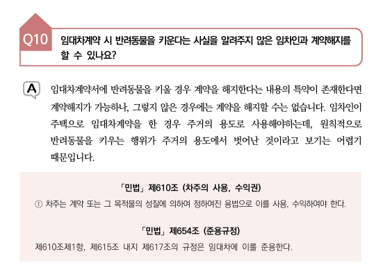 ▷ 해당 내용에서는 임대차계약서에 반려동물을 키울 경우 계약을 해지한다는 특약이 존재한다면 가능하지만, 특약사항이 없다면 계약해지가 불가능하다고 말하고 있습니다.
