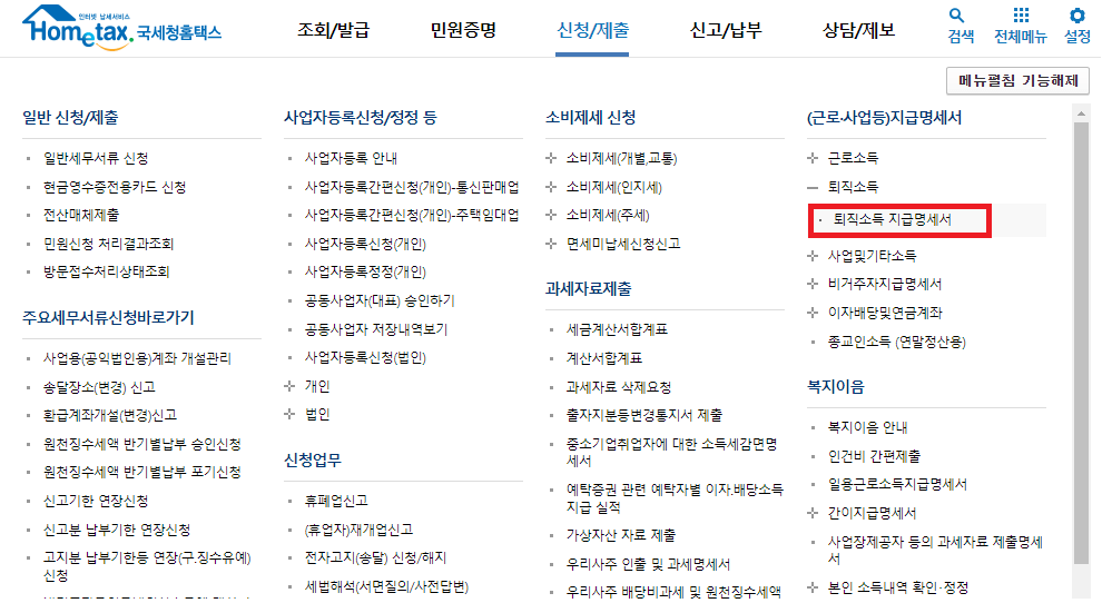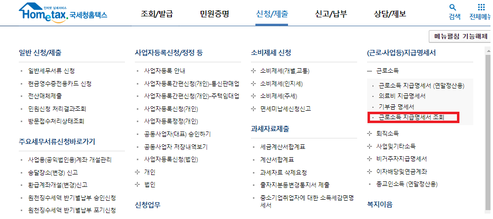 ▷ 국세청 홈택스에 공인인증서로 로그인 한 뒤에 → 신청 / 제출 → ' 근로소득 지급명세서 조회 ' 를 클릭합니다.