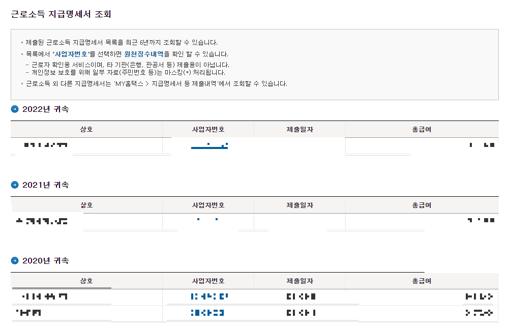 ▷ 이후 공인인증을 한번 더 확인 한 후에 아래와 같이 본인의 원천징수 영수증을 볼 수 있습니다.