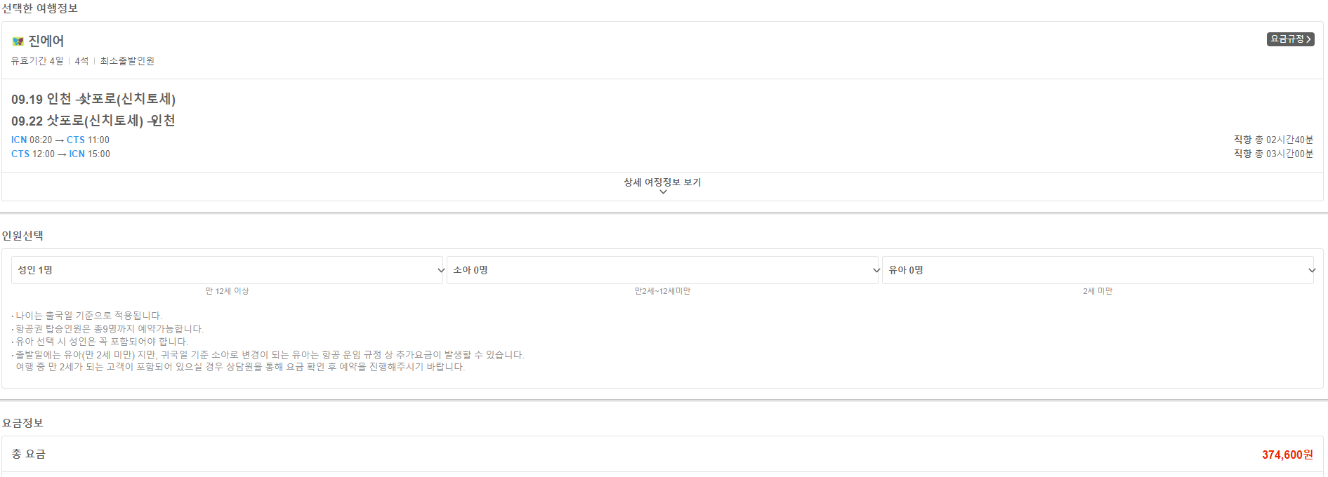 - 공동구매 항공권으로 최저가 항공권 예매한 금액은 374,600원 입니다.