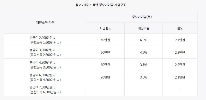 - 은행이자 + 비과세 혜탹 + 정부기여금 (입금한 금액에 비례해서 소득구간별 정부기여금 지원 합니다.)