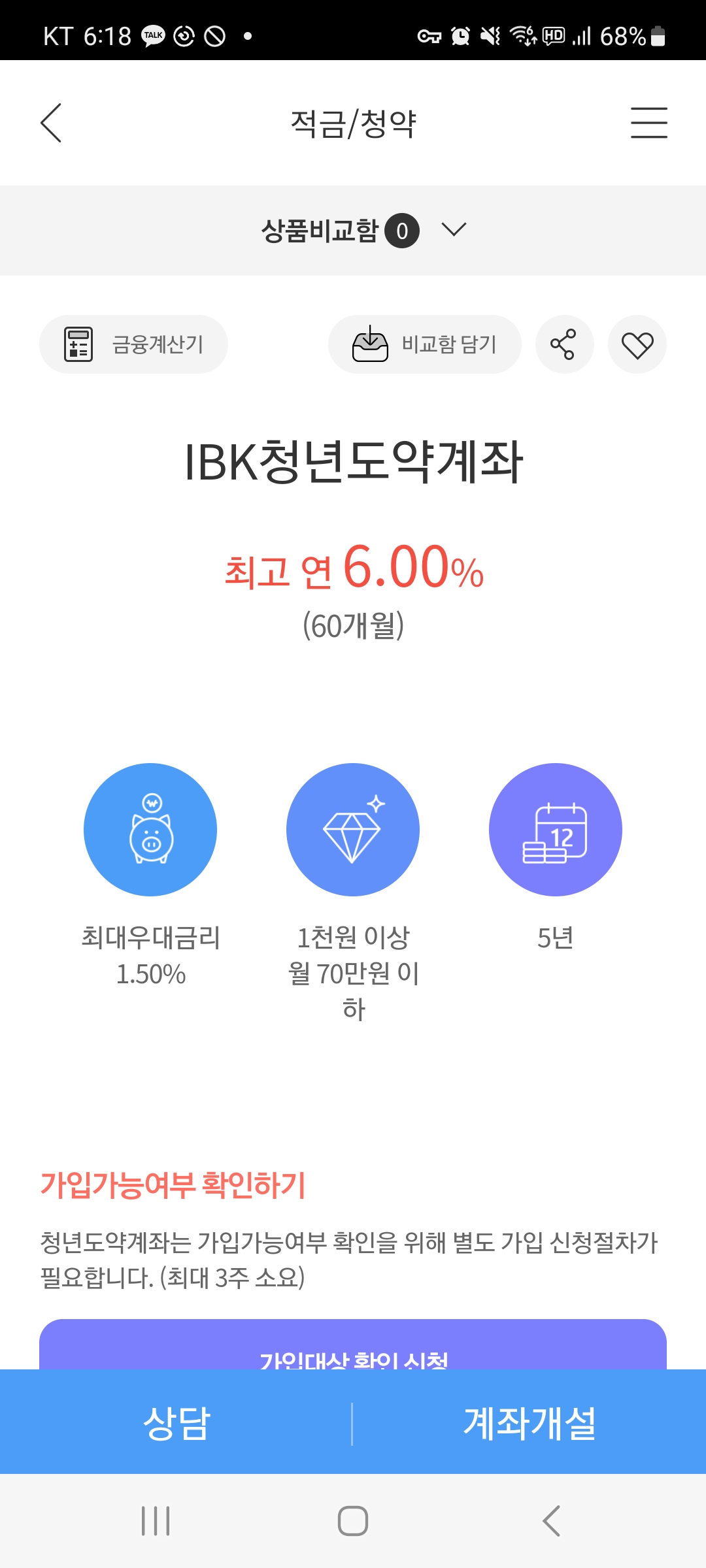 ▷아래와 같은 모습으로 해당 상품이 청년도약계좌 상품이 맞는지 확인 하신 후에 계좌개설을 누르시면 됩니다.