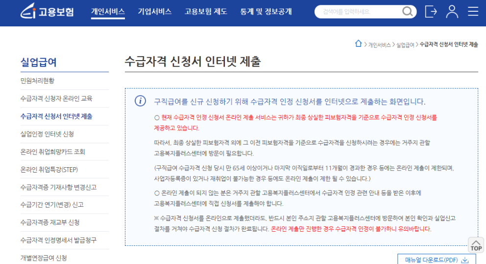 ▷ " 고용보험 "사이트 접속 → " 로그인 " → 개인서비스 → " 수급자격 신청서 인터넷 제출 " 선택