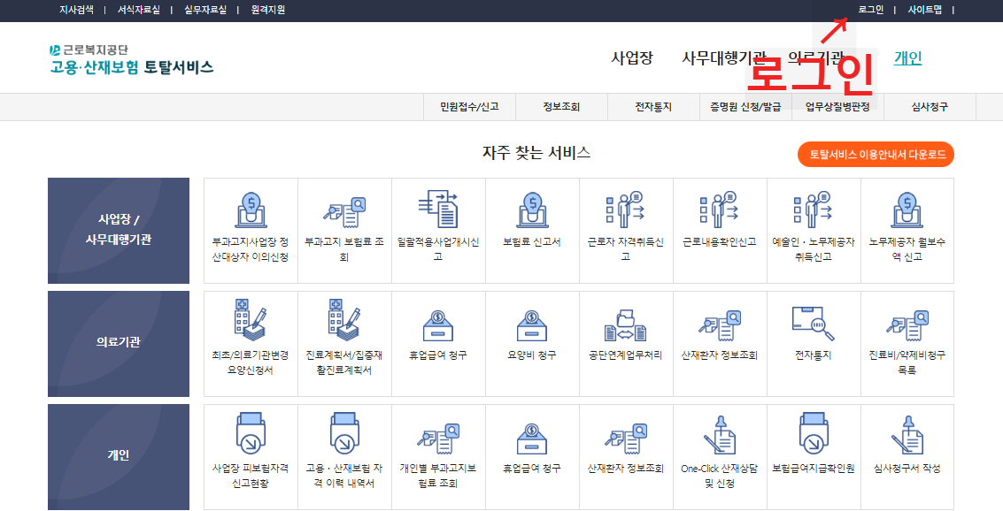 ▷ 피보험 자격상실 확인을 위해 먼저"고용산재토탈서비스" 에 접속해줍니다.
