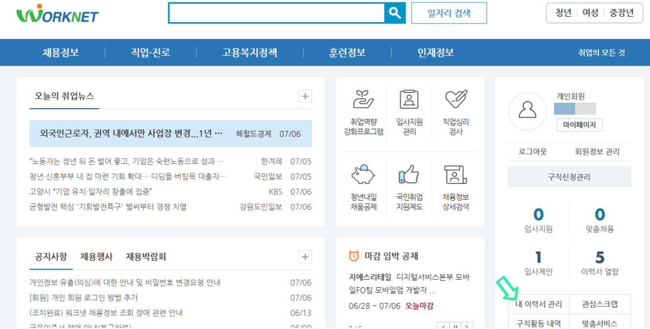 ▷ 워크넷 홈페이지 접속 → " 회원가입 " → 위 화면에서 "내 이력서 관리" 선택→ 이력서 작성 의 순서를 진행해 주세요.