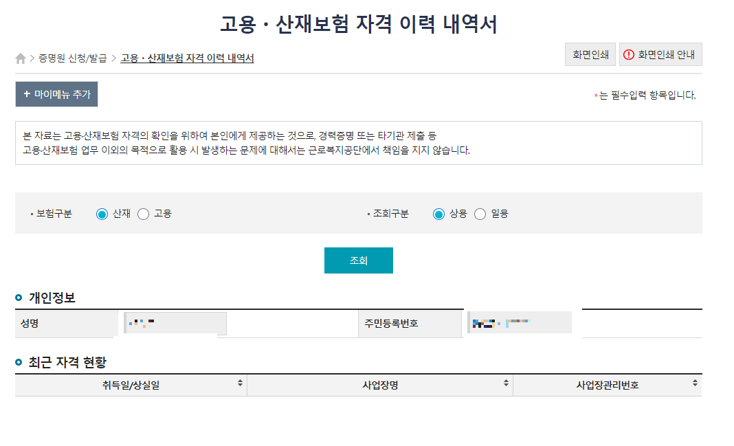 ▷ 산재/고용과 상용/일용을 선택하여 조회를 누르면 자격현황과 상세 이력을 알 수 있습니다.