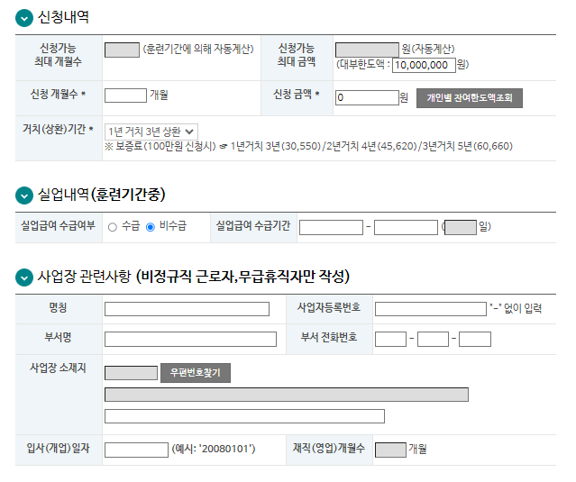 ▷ 신청내역란에서 선 신청 개월 수와 신청금액만 적으시면 나머지는 자동으로 산출됩니다.