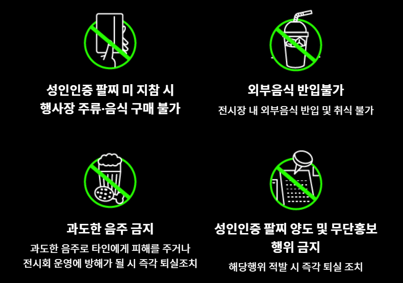 - 입장객은 행사 주최사가 발급한 공식 성인인증팔찌를 반드시 착용합니다.