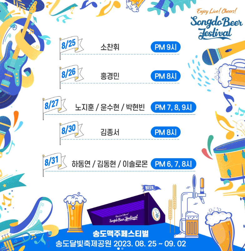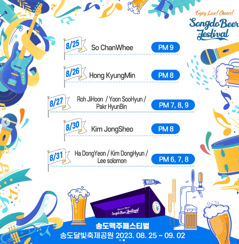 ▷ 송도 맥주축제의 라인업입니다. 좋아하시는 연예인의 참여하는 날을 확인해보세요!