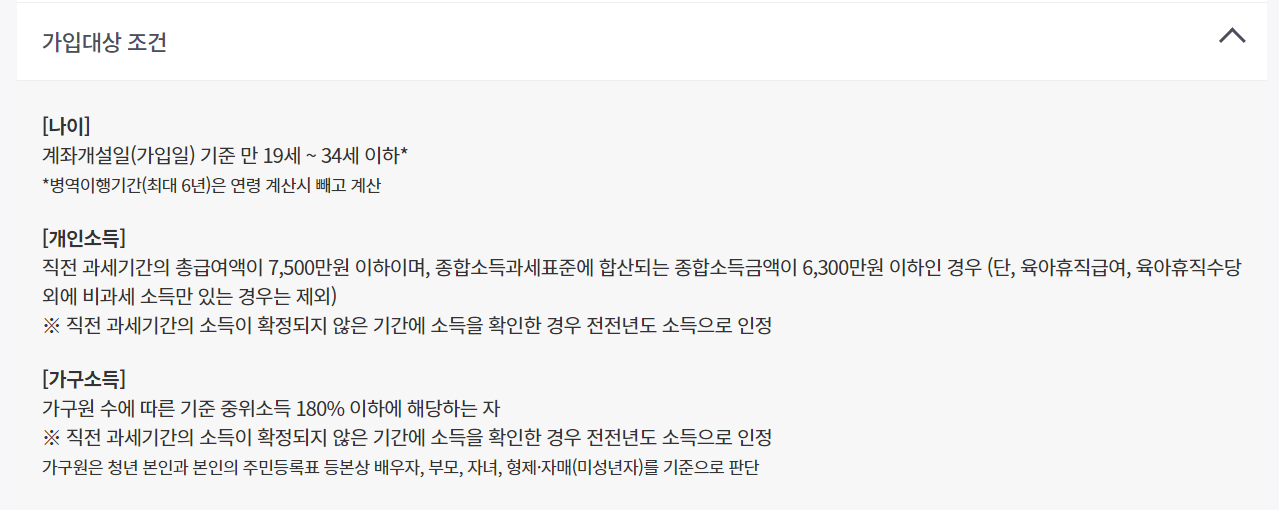 - 나이 : 만 19세 - 만 34세 단, 병역이행기간 최대 6년은 연령 계산 시 제외