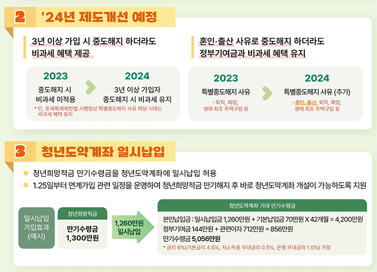 2. 정부에서는 청년도약계좌의 가입을 늘리기 위해서 3년 이상 가입(최대5년만기 상품) 한 경우 중도 해지를 해도 비과세 혜택은 적용해 주기로 했습니다.