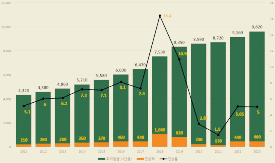 ▷ 작년 2023년 최저시급은 9,620원으로 2022년에 비해서 5.0% 증가하였습니다.